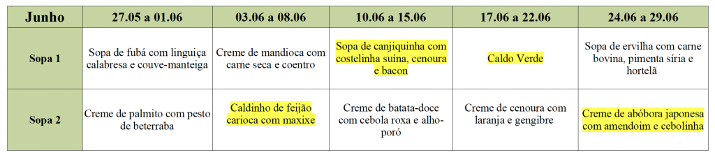 Atenção: Aos domingos e feriados não são servidas sopas nem tigelinhas.