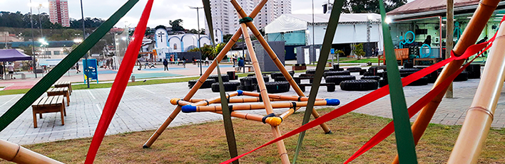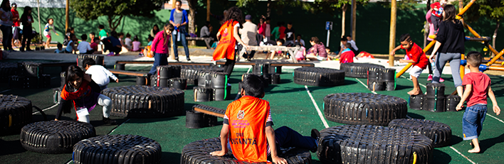 Compreendem as instalações lúdicas como parque de bambus, circuito de saltos e equilíbrio, tanque de areia e jogos gigantes.