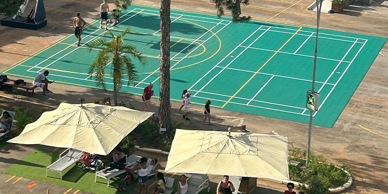 Uma área ao ar livre com 2.450 m² para brincar, curtir e descansar, onde também há espaço para lazer em grupo, atividades artísticas e práticas esportivas.