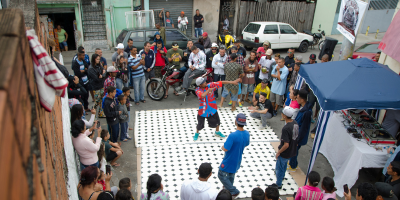 Não é a toa que o poder do raciocínio é sugerido no nome do principal grupo de rap no Brasil, o Racionais MC’s (ainda que a inspiração tenha vindo do “Tim Maia Racional”). Como um movimento sociocultural global que uniu jovens de distintos contextos marginalizados, o Hip Hop chegou ao Brasil no final dos anos 1970, tendo como porta de entrada os bailes black e a cultura de massa associada à black music. Assim como nos Estados Unidos, a dança foi o primeiro elemento a ganhar a atenção da juventude, nos bailes, nas festas de “fundo de quintal” nas periferias, e nas ruas do centro da cidade de São Paulo, com destaque para a estação do metrô São Bento.