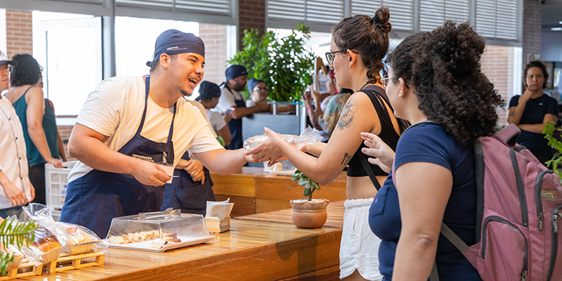 Como conclusão, no dia 18 de março, das 13h às 16h, o Sesc Sorocaba abrigou a Feira de produtos artesanais do curso Cozinha Empreendedora. Nela, os participantes puderam ofertar os produtos desenvolvidos no curso, tendo então sua primeira experiência de comercialização do que aprenderam nas aulas. “Foram comercializados mais de 400 itens, como trufas, brownies, focaccias e pães caseiros – receitas propostas pelo próprio chef, executadas pelos participantes. Na produção, um dia antes da feira, eles foram divididos em grupos, tiveram suas lideranças e colocaram em prática os ensinamentos do curso.“, diz Érica. Durante a feira, eles também transitaram por outros aspectos práticos que conheceram no curso, como atendimento, venda e organização do estoque. O fechamento também foi marcado pelo recebimento do certificado e de um kit básico de utensílios, para incentivar que cada participante inicie seu trabalho.