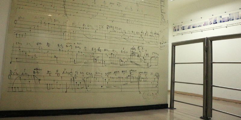 Partitura de Hermeto Pascoal “Brasil que vai, Brasil que vem” na entrada do Centro de Música
